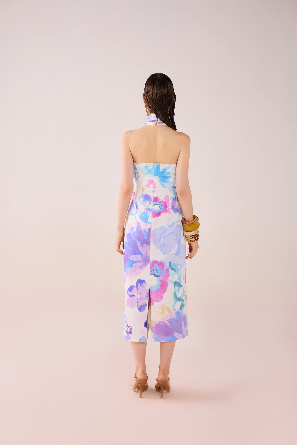 Acqua floral draped midi with crossover halter neckline