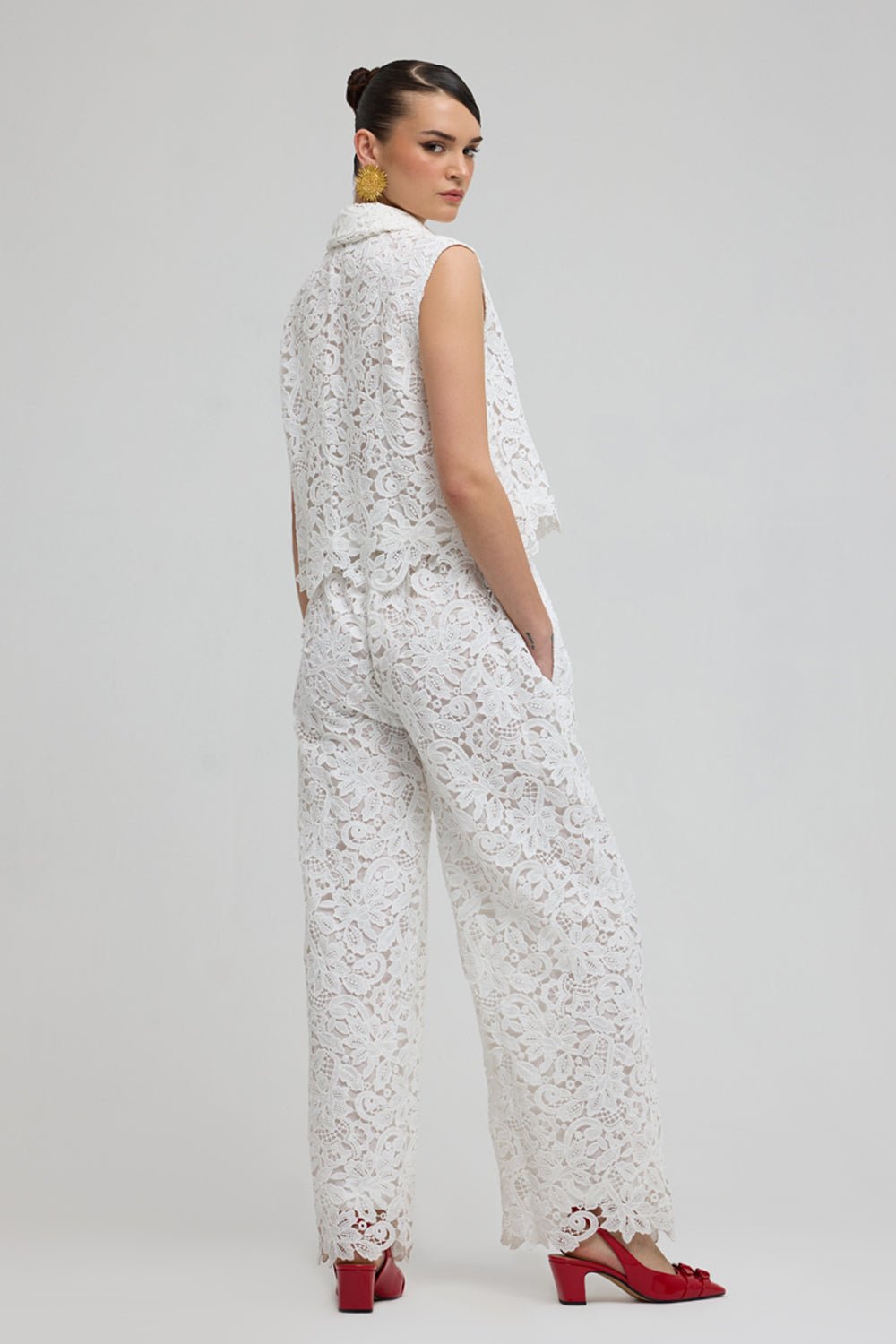 Lace waistcoat with straight fit lace pants. Fully lined. Gold button detailing. Front opening.