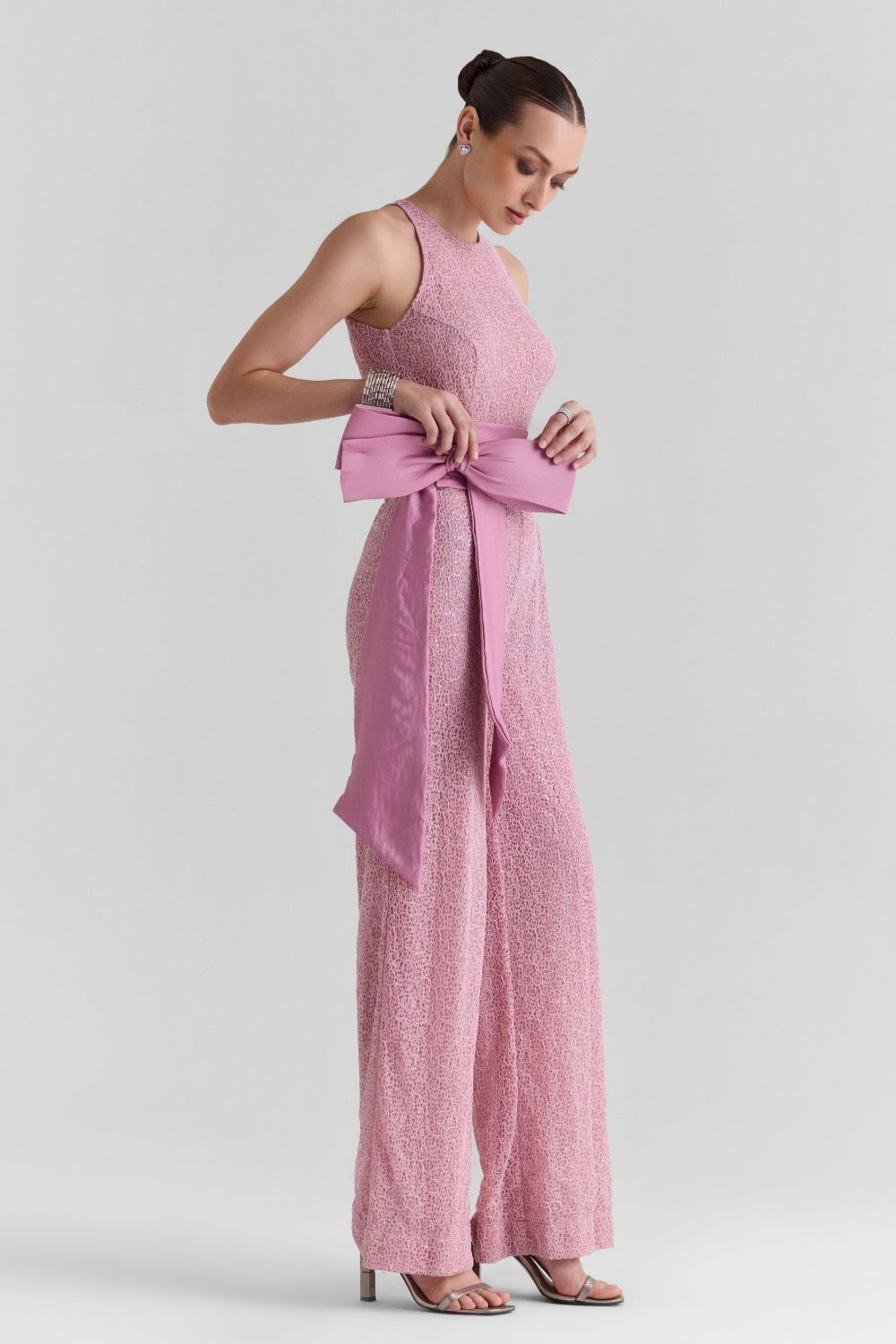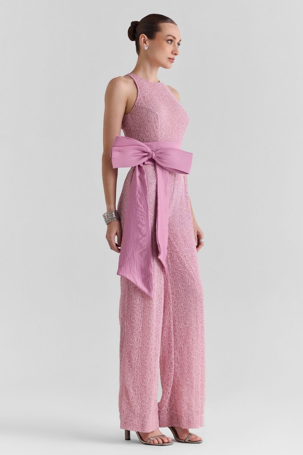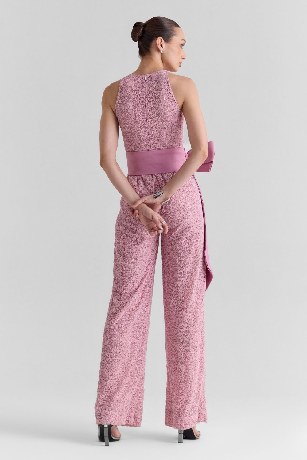 Striking in detail, this pink fitted lace jumpsuit is designed with straight-fit pants and a smooth stretch lining for comfort. A detachable structured satin bow belt with concealed hooks adds a statement finish, while a concealed back zip ensures a seamless fit. Elegant yet playful, it is a standout choice for cocktail evenings, festive gatherings, or celebratory soirées.