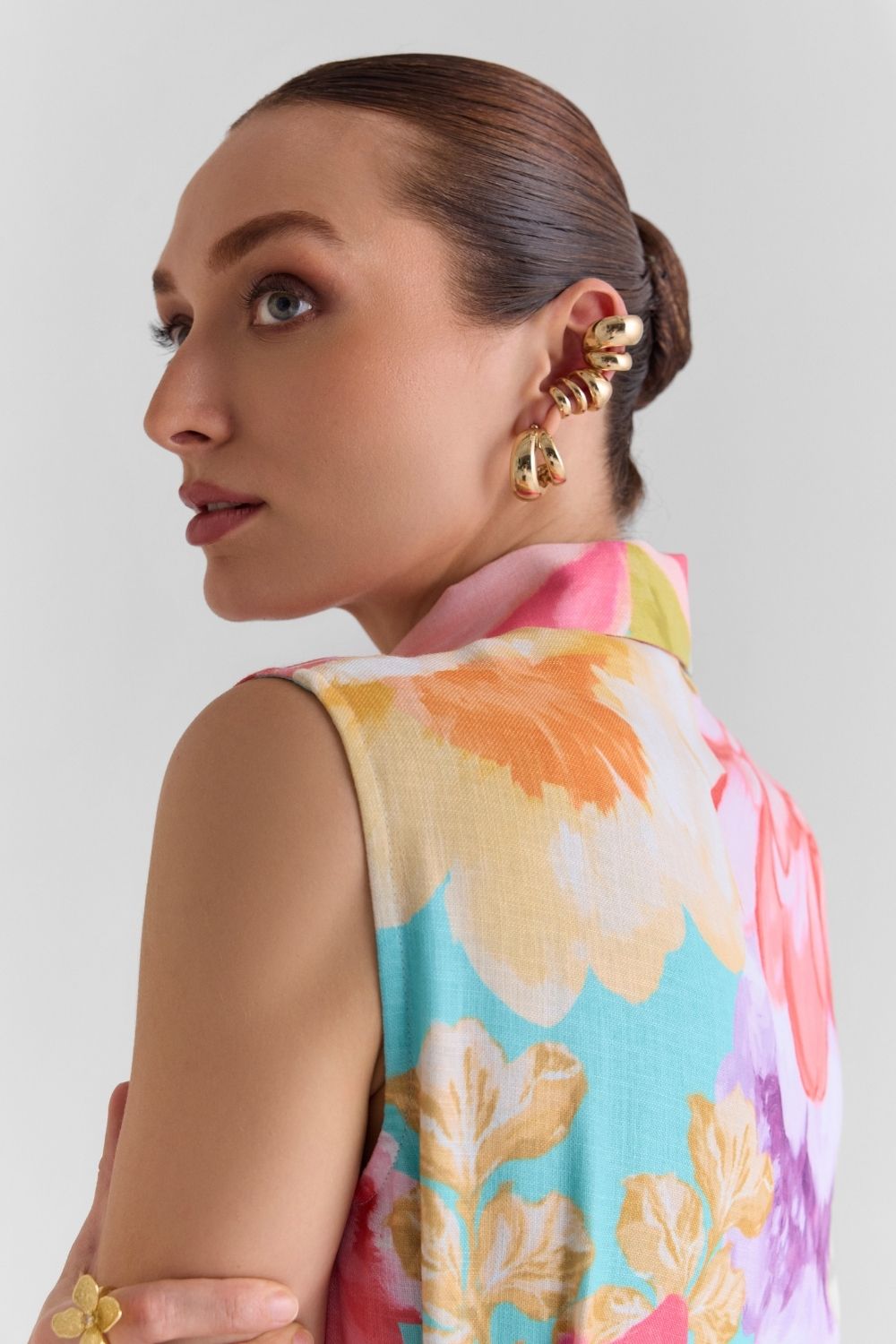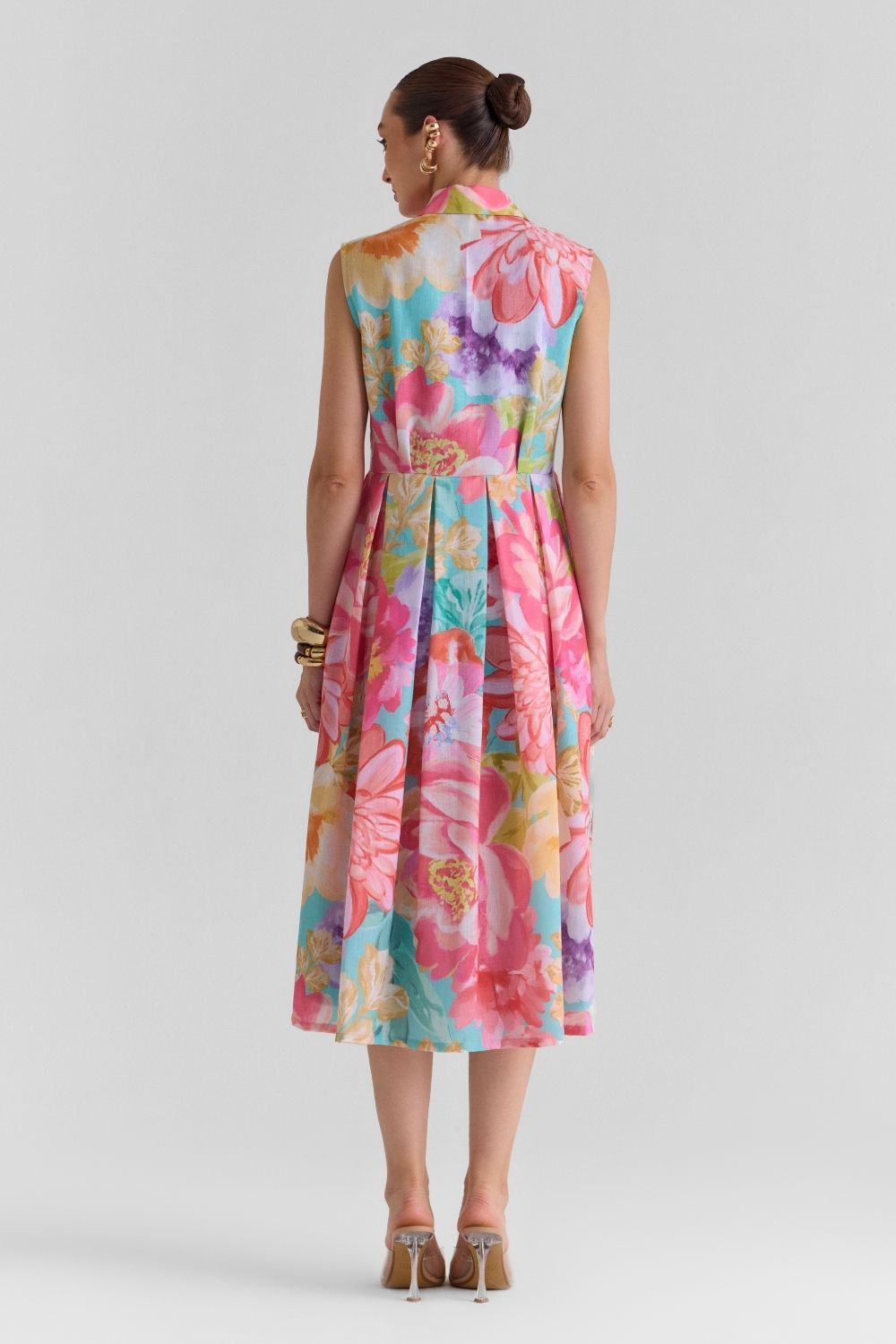 Alive with color, this blue midi dress in vibrant multicoloured floral print is tailored with a fitted bodice and a flared, pleated skirt for graceful movement. A detachable fabric belt cinches the waist for definition, while a concealed back zip ensures a seamless finish. Playful yet polished, it is perfect for daytime celebrations, resort escapes, and festive brunches.