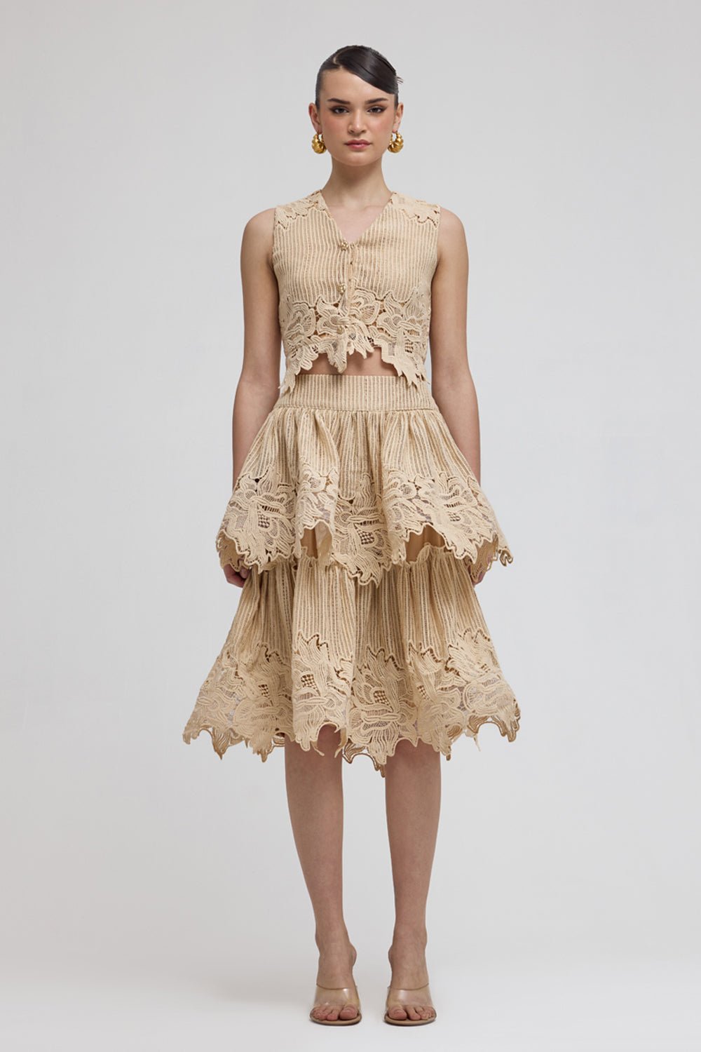 Beige scalloped floral layered skirt with waistcoat. Front opening. Fully lined.