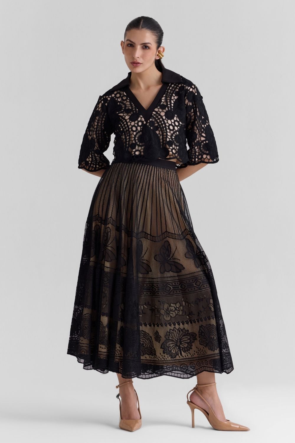 Modern yet romantic, this set pairs a black lace oversized crop top with a sharp collared neckline and soft beige lining, creating a play of structure and delicacy. It is styled with a black butterfly lace midi skirt, flared for movement and finished with a matching beige lining for subtle contrast. Together, the pieces strike a balance between bold detail and refined elegance—perfect for occasions that call for statement-making sophistication.