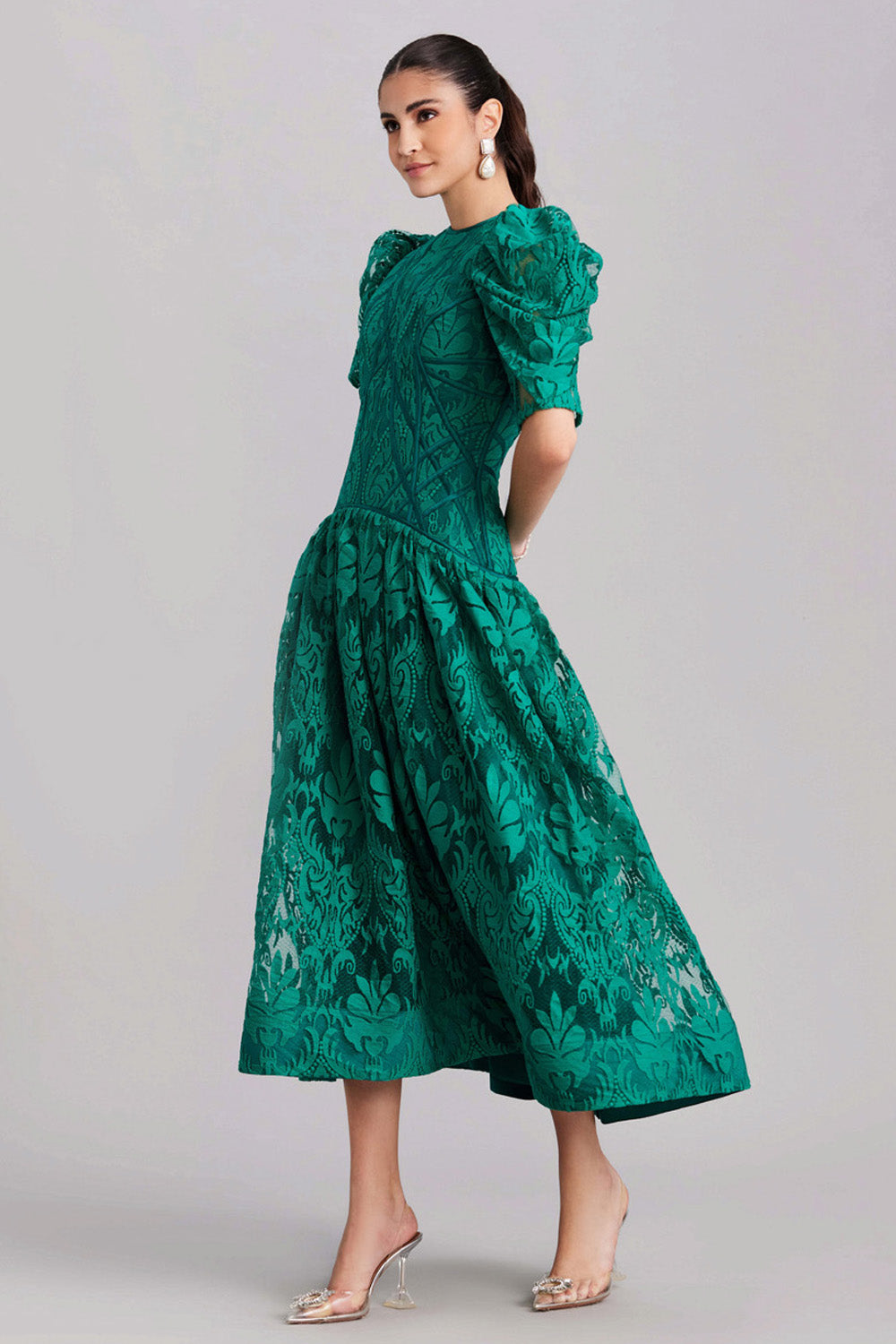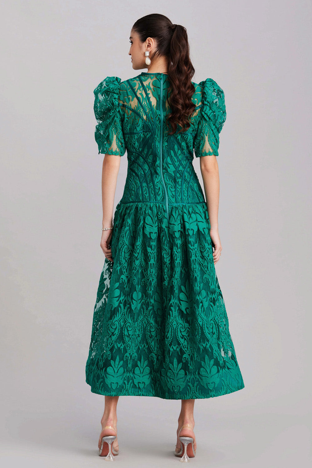 Round neck corset style bodice with low waist flared bottom midi dress. The dress has puff sleeves and satin base.