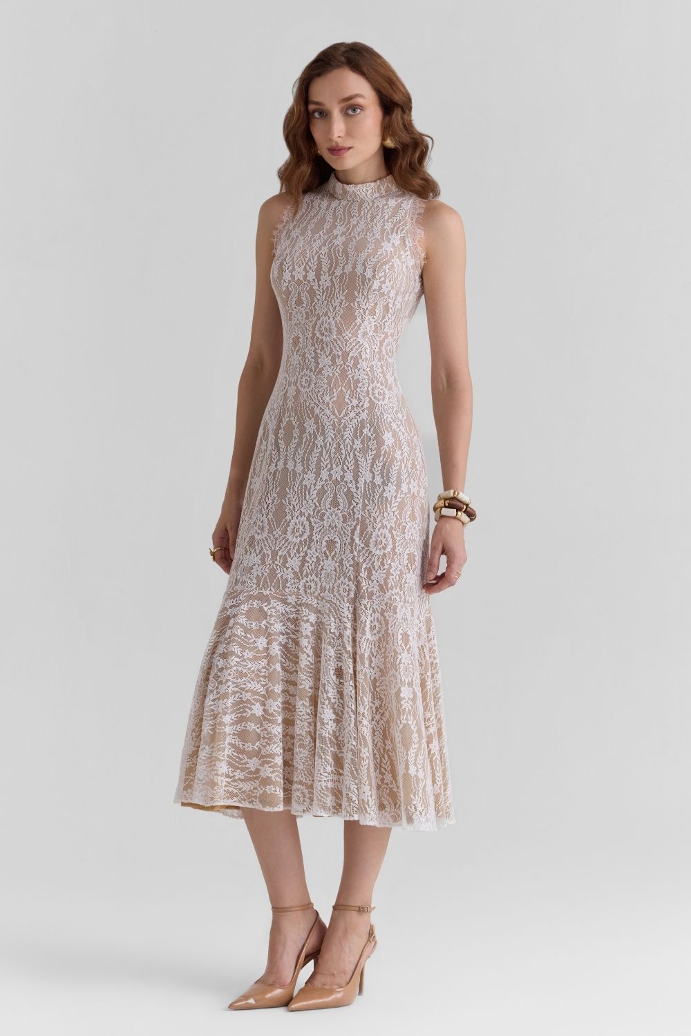 Refined and versatile, this white lace midi dress balances elegance with ease. Designed with a soft lace overlay on a subtle beige lining, it offers delicate texture with a modern touch. The fitted bodice flows into a gentle flare, creating a flattering silhouette that’s both polished and comfortable. Finished with a sleeveless cut and a discreet back zip, it’s an understated yet striking choice for daytime occasions or evening gatherings.