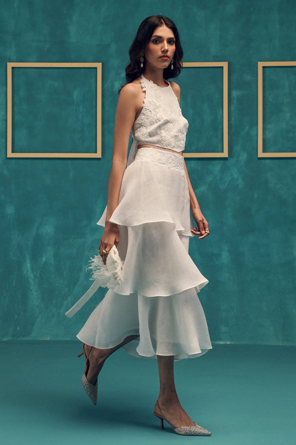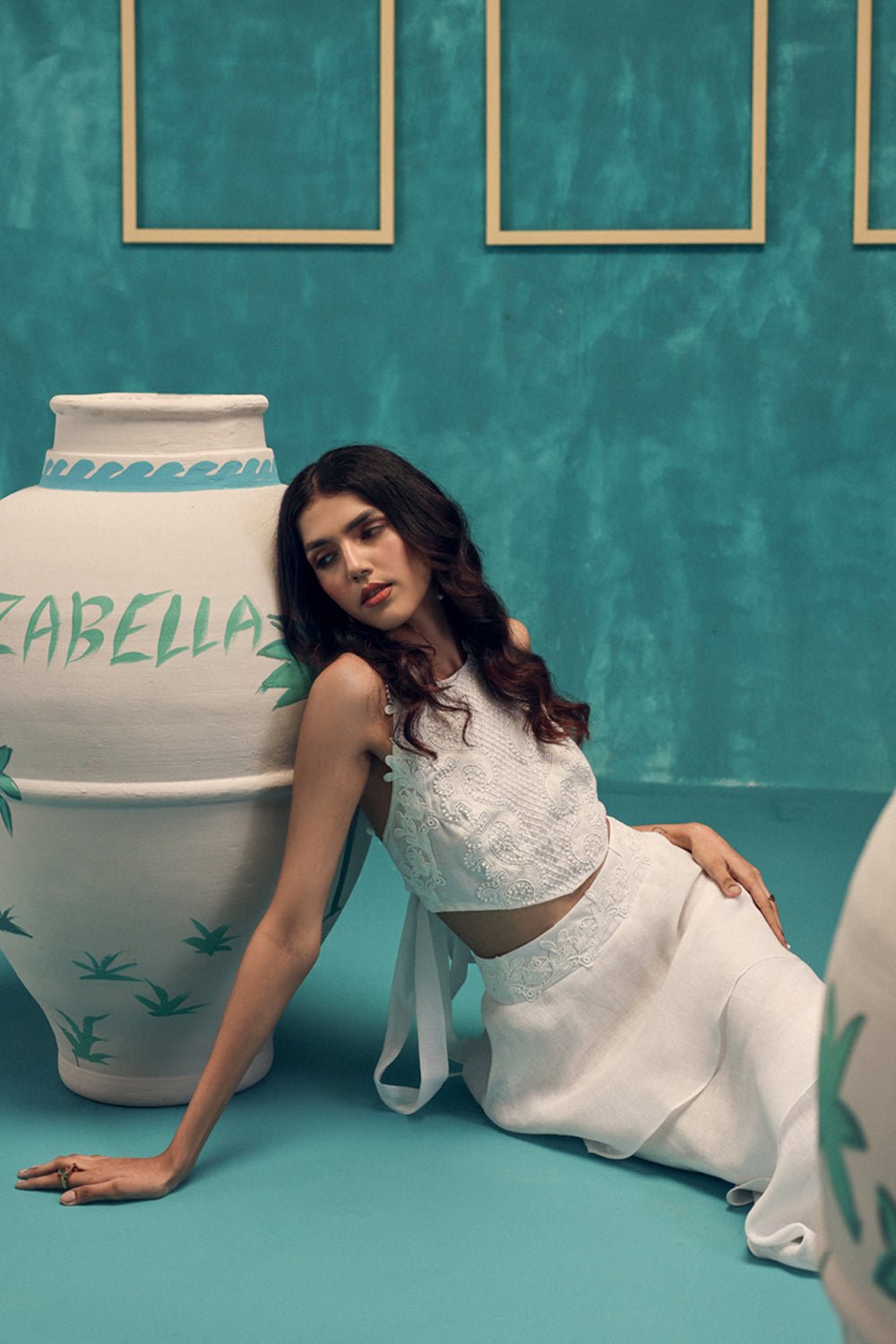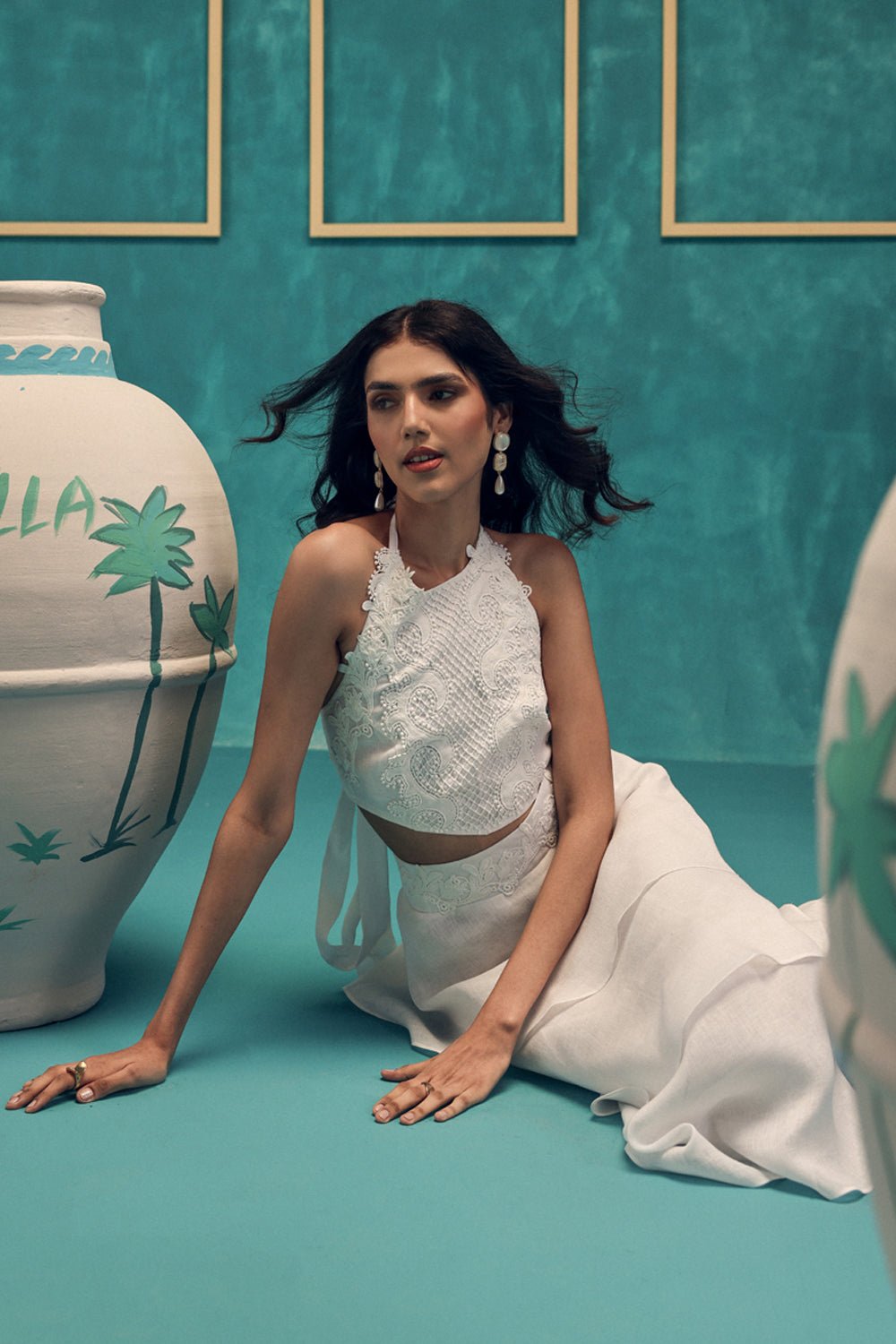 Breathe easy in this dreamy white linen co-ord set, designed to keep you cool and effortlessly chic. Featuring a relaxed, layered silhouette, the set includes a lightweight sleeveless top with lace detailing and breezy high-waisted layered skirt tailored for comfort and flow. Crafted in lightweight linen, it’s the perfect blend of softness, structure, and sophistication. Style it with minimal gold jewelry and sandals for sun-drenched days, or elevate it with heels and a sleek bun for balmy evening outings.