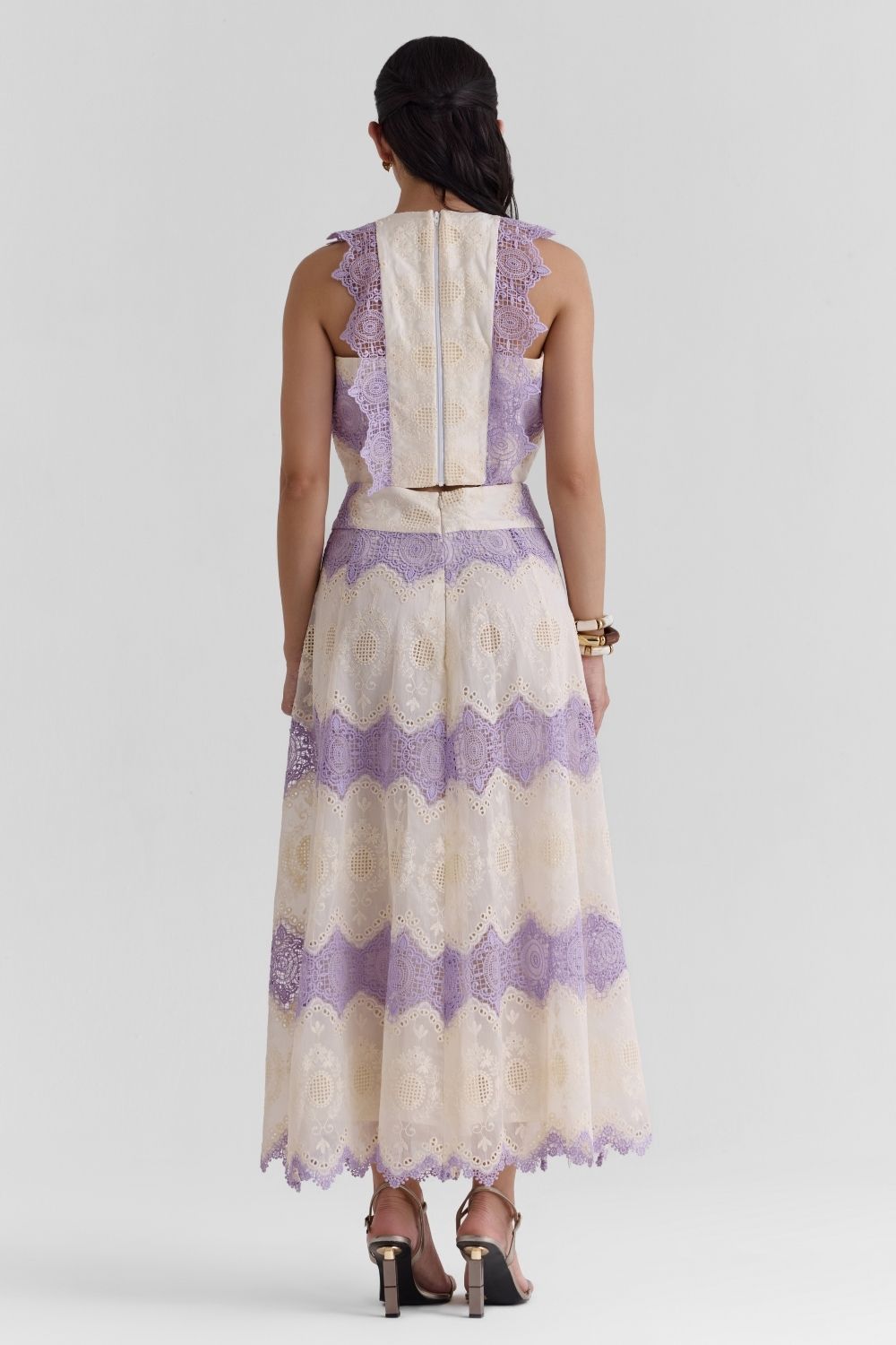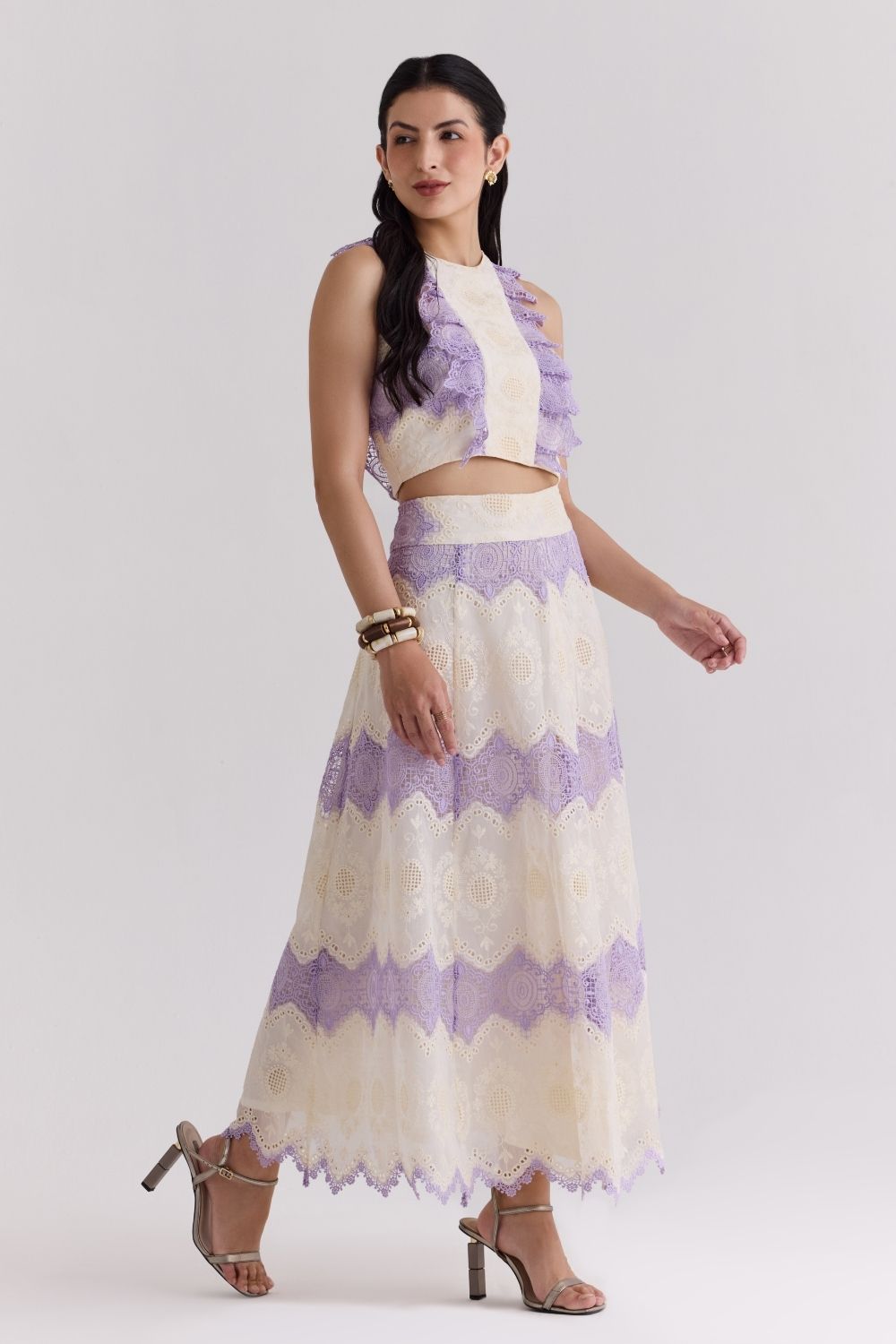 Delicate and feminine, this lavender and off-white shiffley set pairs a flared skirt with a ruffle-detailed crop top. Cut for graceful movement and finished with a concealed back zipper, it balances youthful charm with refined elegance. A versatile choice for daytime celebrations, festive gatherings, or destination getaways.