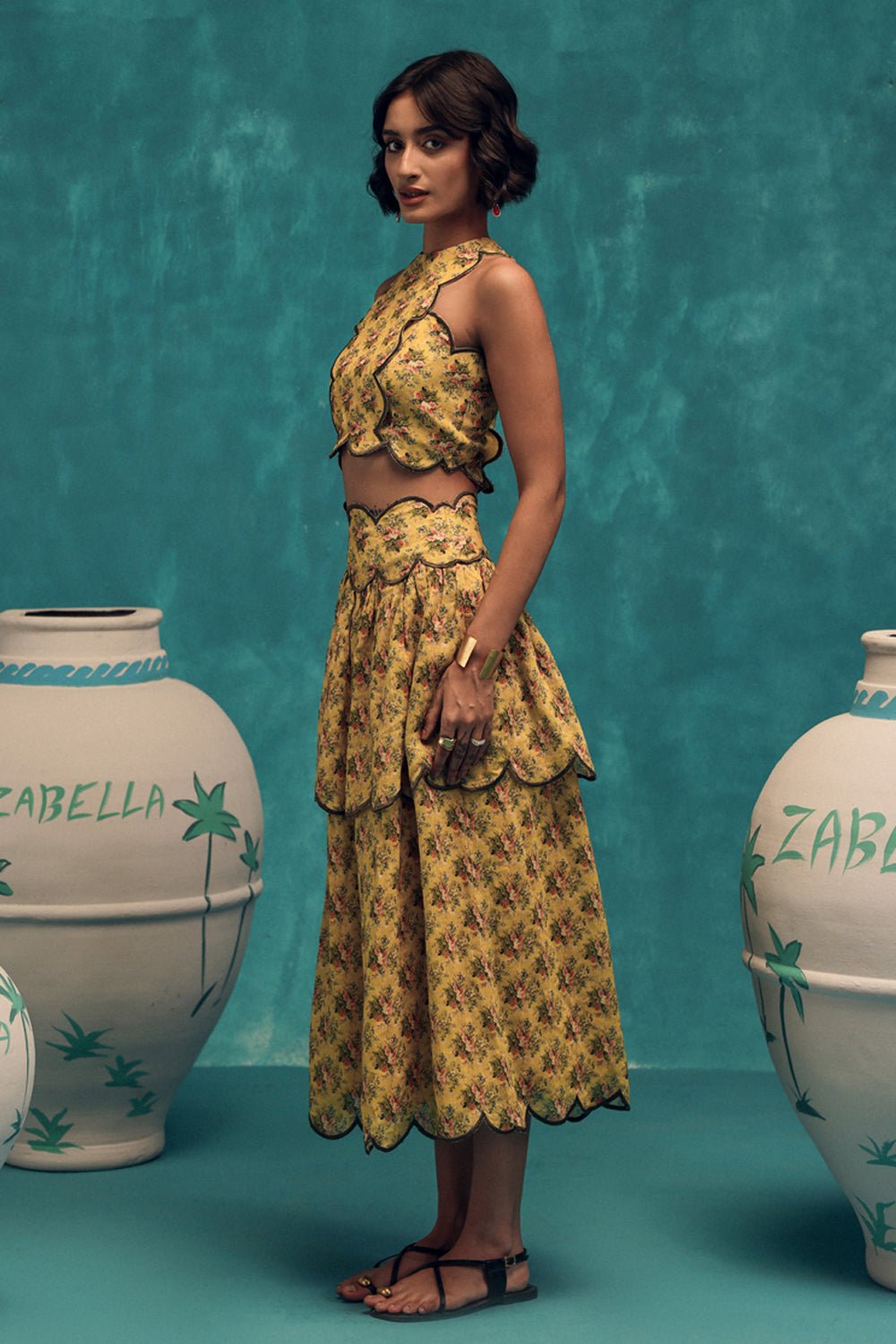A fresh take on feminine flair, this floral printed cotton set is made for sunlit escapes and carefree moments. The halter neck top flatters the shoulders with a graceful neckline, while intricate floral embroidery adds texture and charm. Paired with a breezy high waisted scalloped layered skirt that moves with ease, the set balances structure with softness. Crafted in breathable cotton, it’s the perfect choice for summer getaways, brunch dates, or festive garden gatherings. Just add dainty accessories and you’re good to glow.