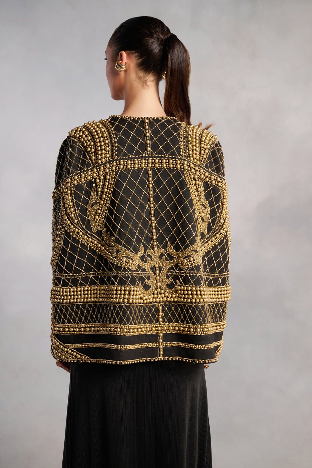 This cape style jacket has a black base with hand embroidered gold pearl design to it.