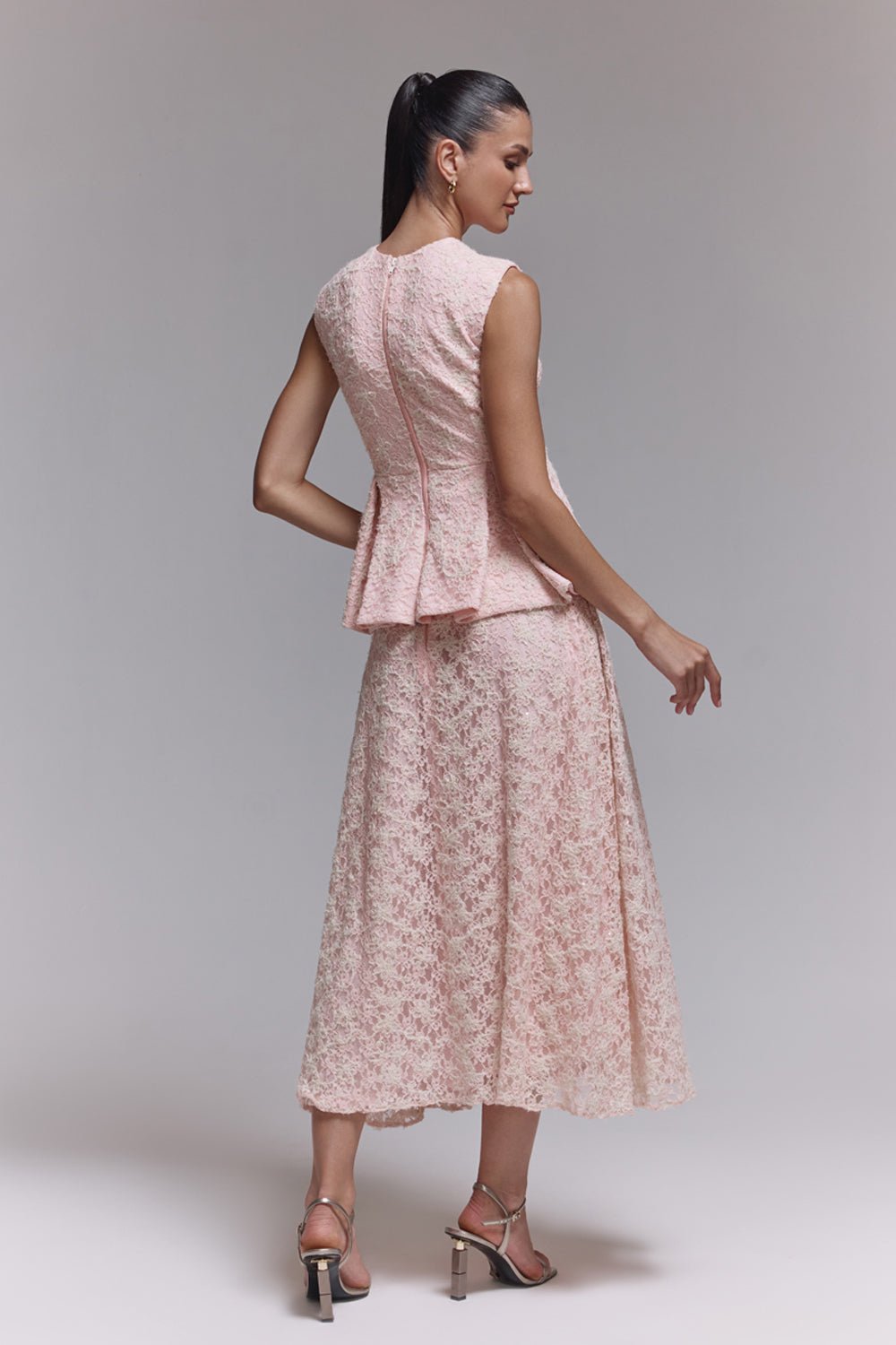 Pink embroidered lace co ord set. The set has a peplum top with detailed buttons on it and is paired with a straight lace skirt.