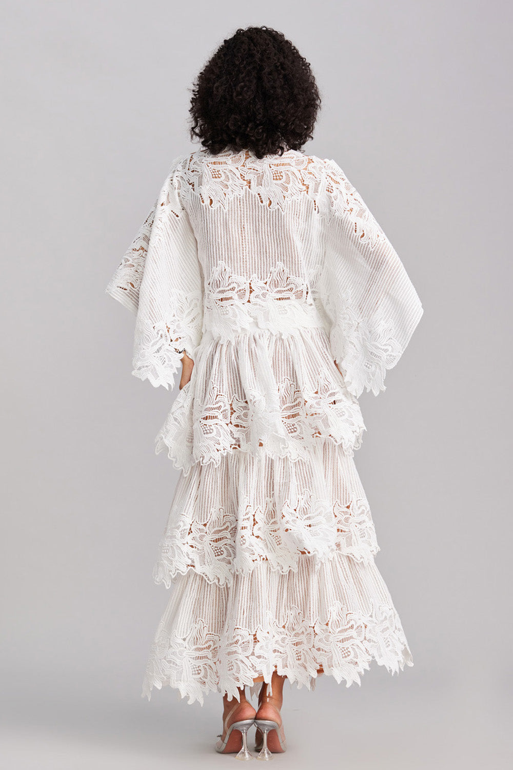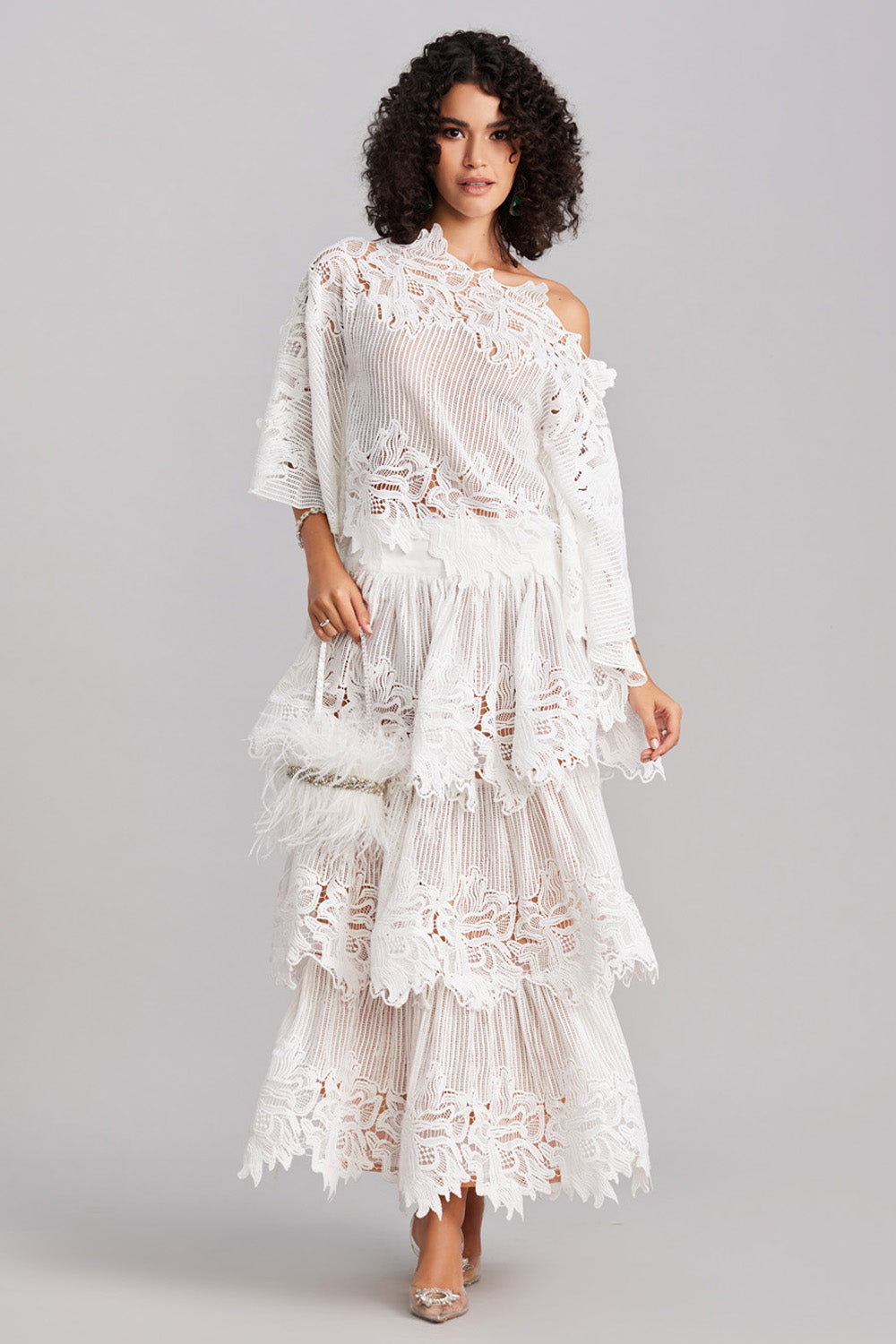 Scalloped white lace top with kaftan style sleeves paired with a double layered scalloped lace flared skirt.