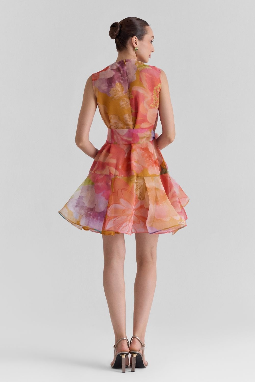 Playful yet refined, this oversized floral printed organza mini dress features a straight-fit bodice that falls into a box-pleated structured hem for volume and movement. The neckline is elevated with delicate rhinestone detailing, adding a subtle shimmer to the airy silhouette. Finished with a back zipper for ease and a fabric belt to cinch the waist, it strikes the perfect balance between structure and softness—ideal for both daytime elegance and evening charm.