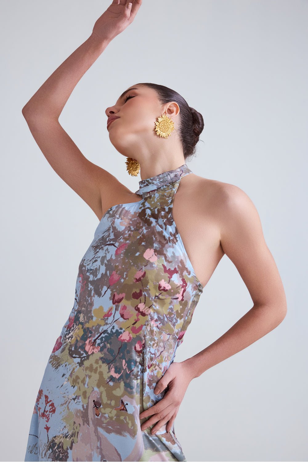 Swan blue satin midi dress with halter neck button closure