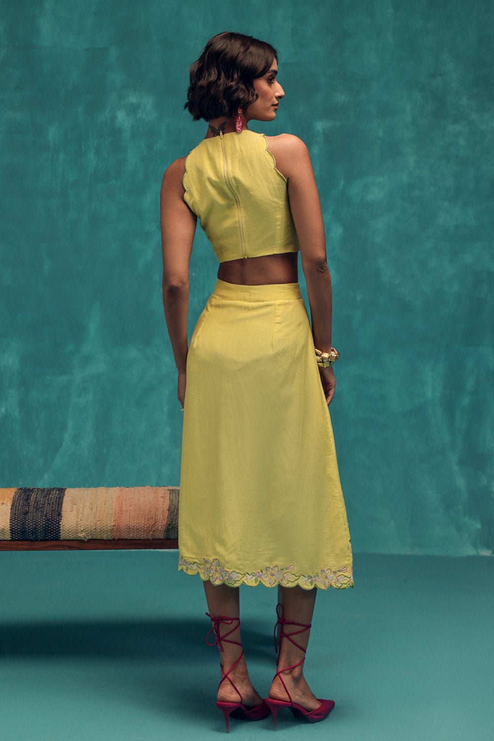A fresh take on feminine flair, this butter yellow floral embroidered cotton set is made for sunlit escapes and carefree moments. The halter neck top flatters the shoulders with a graceful neckline, while intricate floral embroidery adds texture and charm. Paired with a breezy layered skirt that moves with ease, the set balances structure with softness. Crafted in breathable cotton, it’s the perfect choice for summer getaways, brunch dates, or festive garden gatherings. Just add dainty accessories and you’re good to glow.